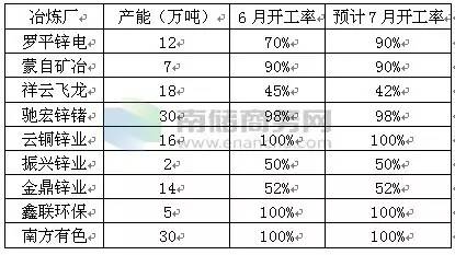 进入七月,随着前期检修的冶炼厂检修结束,开工率整体稳定,罗平锌电在丰水期开工率继续提升。