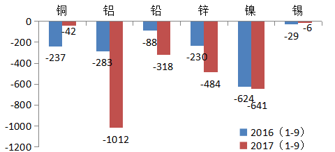 在供需端双向的作用之下,2017年以来全球多数金属产品的短缺程度较2016年均有所扩大。就基本金属品种而言,2017年前三季度累计,铝、锌、铅市场短缺程度明显加剧,而铜、锡市场短缺程度略有缓解。从季度市场均衡变化来看,铝、铅、锌、镍短缺持续加剧,而下半年之后铜、锡市场短缺则出现明显缓解。此外,由于前三季度全球铝土矿、锌精矿、铅精矿及镍精矿产量均出现明显萎缩,致使这些品种的市场贡献缺口持续扩大。