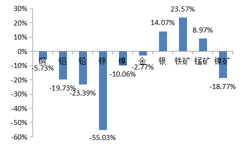 图4:截止年11月30日主要金属及矿产库存较年初变化情况
