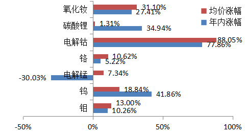 2017年至今,与新能源新材料有关的小金属品种价格也出现暴涨。其中,碳酸锂(上海)价格从2016年末的12.45万元/吨,到2017年11月末上涨到16.8元/吨,涨幅接近40%;电解钴(上海)价格由26.8万元/吨涨至48.2万元/吨,涨幅接近80%。此外,钨、稀土等品种2017年至今的价格涨幅也在30%-40%左右,铬、钼金属价格涨幅相对较低,尽管电解锰11月末价格较2016年末出现大幅下降,但均价涨幅仍达到7.34%。