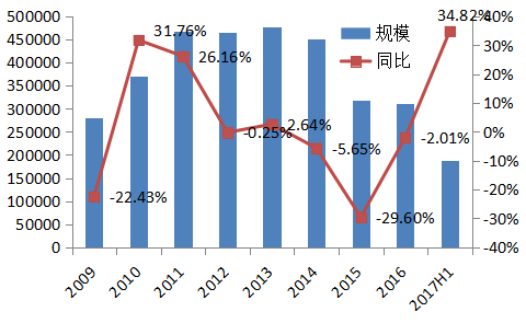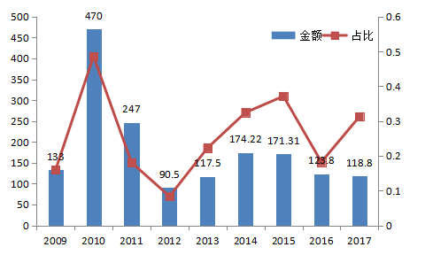 图13:2009年以来全球采矿和煤炭领域并购金额变化(亿美元)
