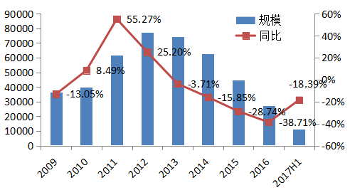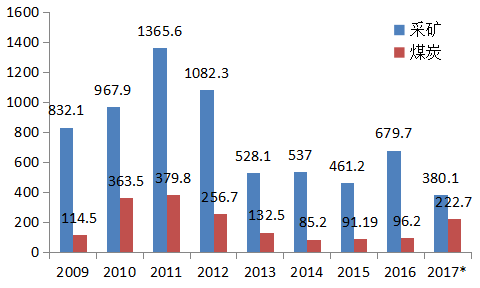 在经历了2016年全球采矿领域并购(包括股权投资)金额创之前四年新高之后,2017年以来市场有所降温。彭博统计数据显示,截止11月末,全球采矿领域共发生并购事件涉及金额合计380.1亿美元,略高于2016年的一半,预计全年在400亿美元左右。在已发生的74件单笔金额超过1亿美元的案件中,仅5件的购买方为全球前十大矿业公司(嘉能可2项,加拿大黄金3项,纽蒙特矿业1项)。不过,2017年全球煤炭开发领域并购活跃,前11个月累计涉案金额达到222.7亿美元,超过去两年规模之和。大型矿业公司(力拓)的业务布局调整及煤炭价格维持高位,成为2017年该领域并购大爆发的主要推手。