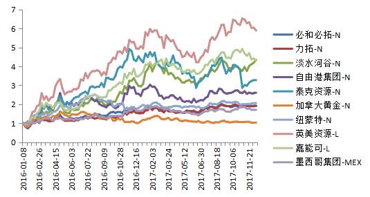 图10:2016年以来前十大矿业公司股价变化(以2016年初为参照)