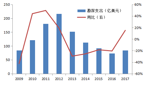 在经过连续五年萎缩之后,2017年全球金属领域勘探投入规模迎来反弹。标普全球情报机构(S&P Global Market Intelligence)统计数据显示,2016年全球金属勘探投入合计为73亿美元,为2006年以来最低。而随着商品价格持续反弹和企业经营实质性改善,2017年矿业公司在勘探投入上逐步转向乐观。前三季度统计显示,相对于年初预算,2017年纳入统计的1706家矿业公司已累计追加了12.37亿美元的勘探投入,而2016年全年实际勘探投入则相对于年初预算削减8.89亿美元。其中,勘探投入追加金额较多的矿业公司包括Antofagasta、Vale、Barrick、Fresnillo等。标普预计,2017年全球金属勘探投入为84亿美元,规模较2016年增加15%左右;而考虑到勘探投入与工业金属价格指数之间的变化关系,预计2018年全球勘探投入增幅将会进一步扩大。