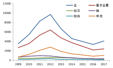 图12:2009年以来全球有色金属领域各商品勘探投入变化(百万美元)